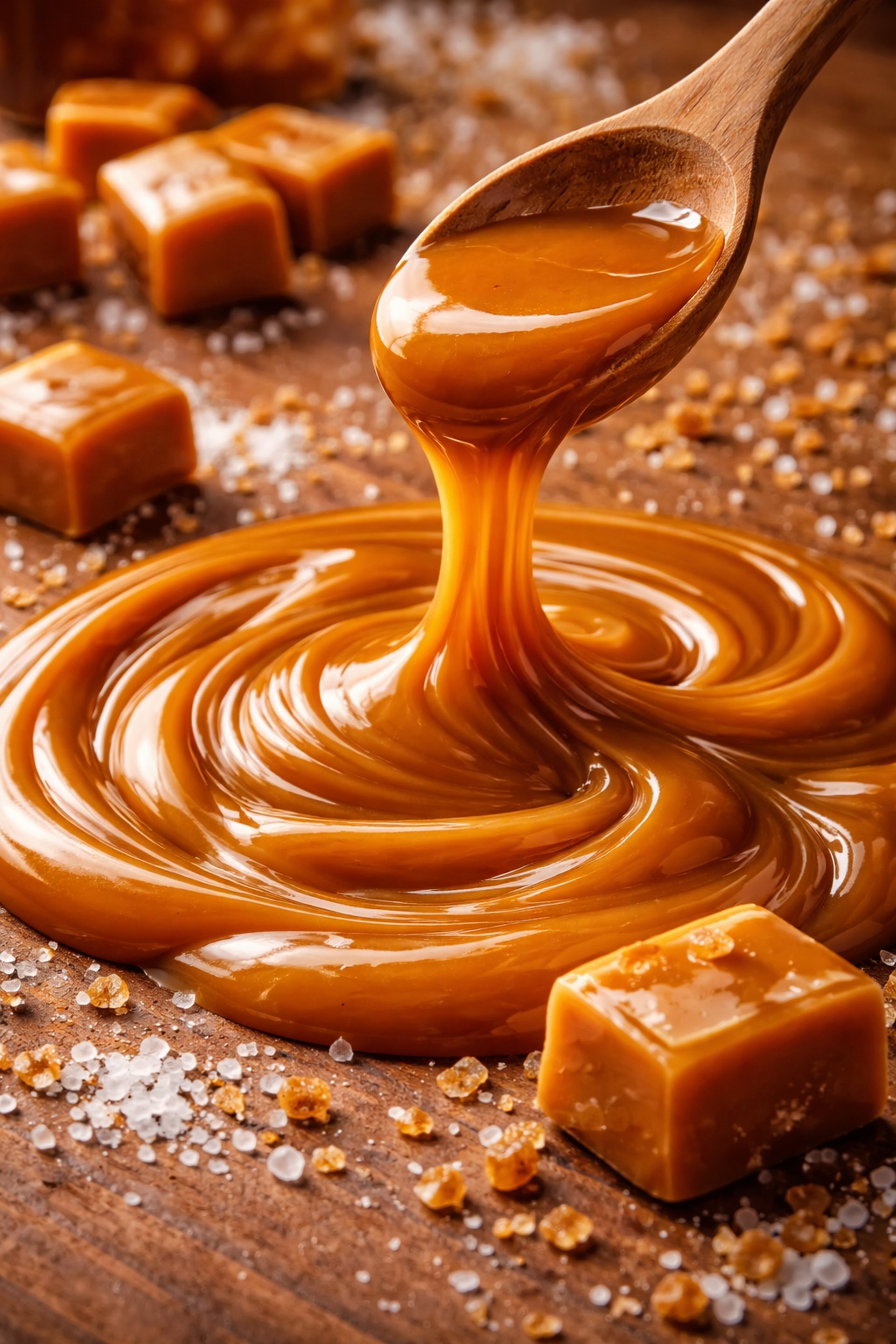 O caramelo é uma calda doce feita a partir da caramelização do açúcar, usada em sobremesas, sobremesas geladas e como cobertura em diversas receitas. Uma versão tradicional inclui açúcar, creme de leite e manteiga para uma textura cremosa e brilhante.