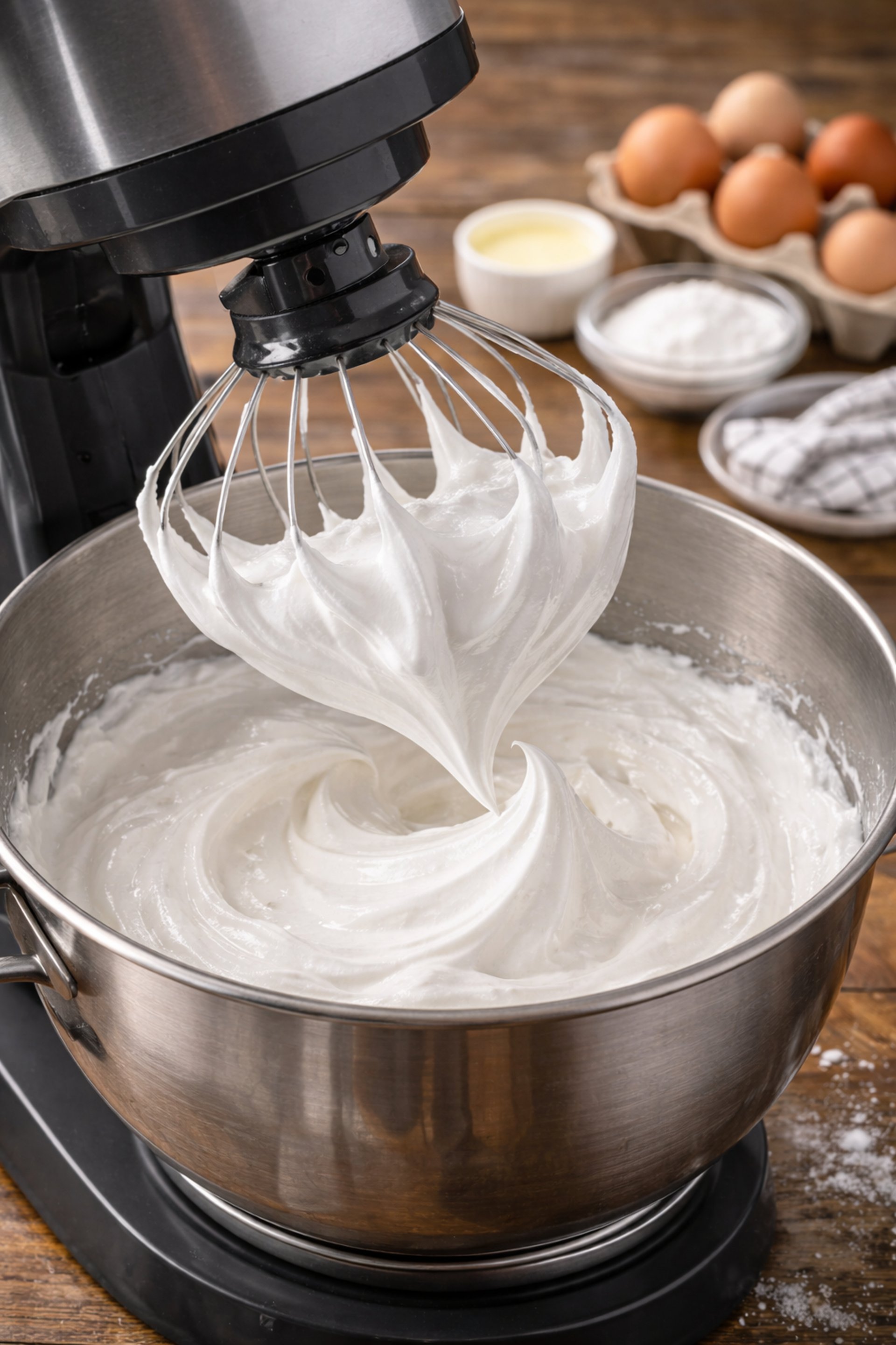 Para obter picos firmes e textura perfeita, utilizar uma batedeira potente ou um batedor de arame profissional faz toda a diferença no preparo do merengue.