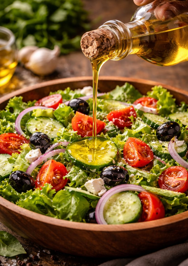 Adicionar azeite a pratos como saladas, massas ou sopas não só melhora o sabor como também a sensação de saciedade, podendo favorecer escolhas alimentares mais saudáveis ao reduzir o consumo de ingredientes menos nutritivos. (Apollo 24|7)